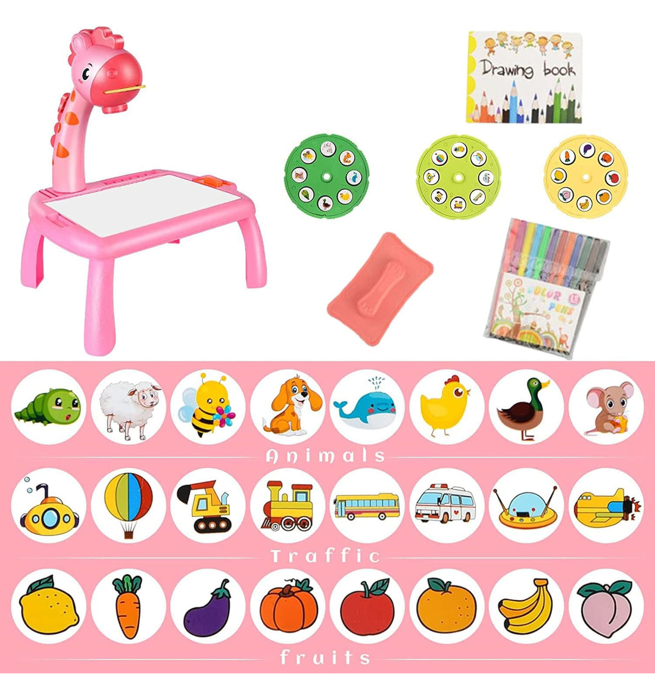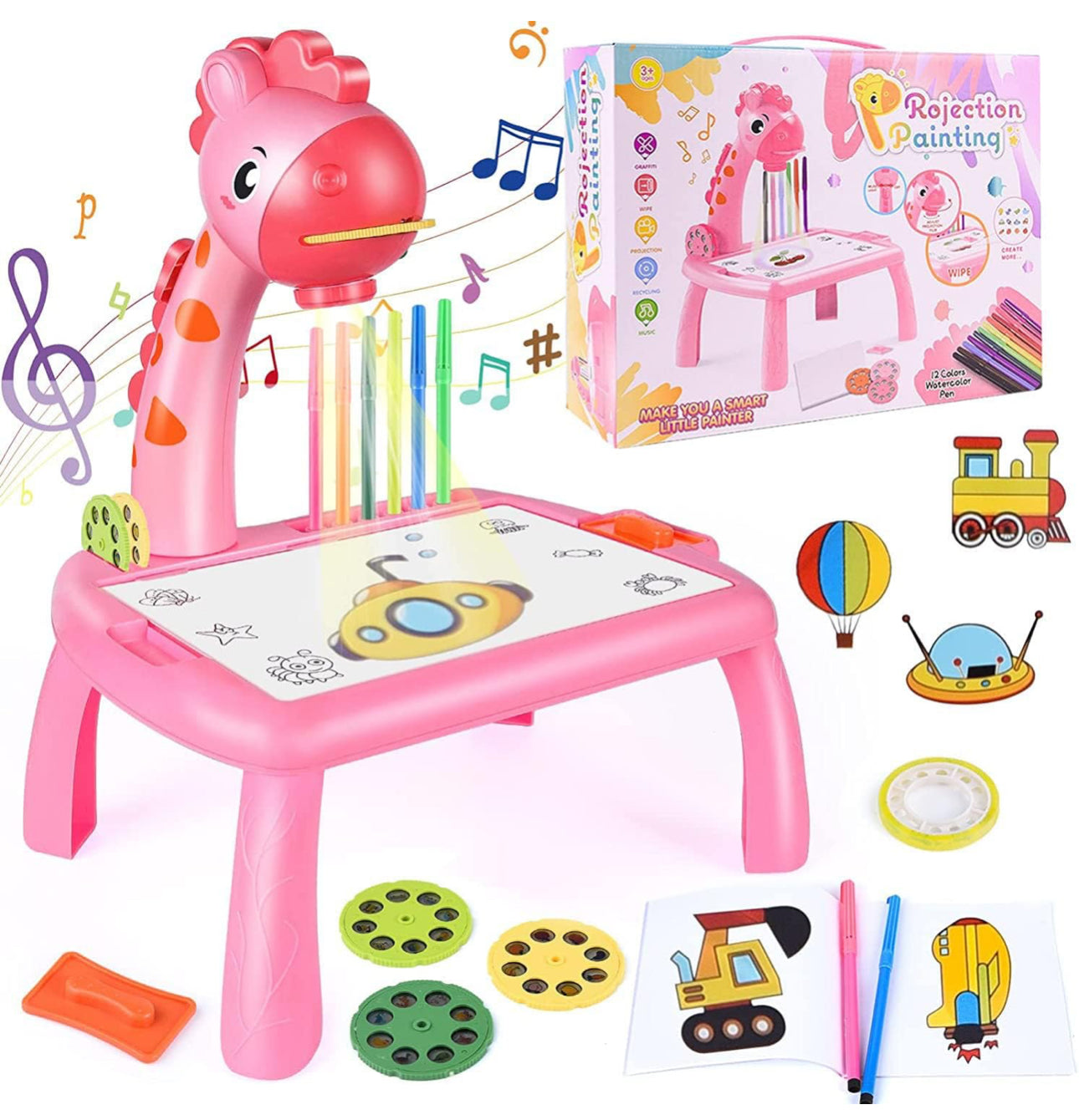 El Tablero de Dibujo Infantil con Proyector es un juguete educativo diseñado para que los niños aprendan a dibujar de forma divertida. Incluye una lámpara de proyección ajustable que muestra diferentes imágenes para calcar, bolígrafos de colores, música relajante y un tablero reutilizable con borrador. Está hecho de material ABS no tóxico y seguro para los niños. Además, ayuda a desarrollar habilidades como la coordinación, la motricidad fina y la percepción visual.